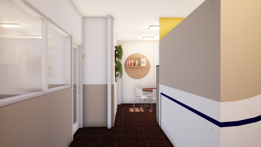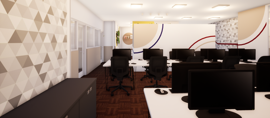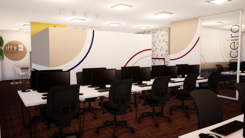 O projeto de aproximadamente 200m2 foi desafiador, pois o espaço era todo dividido com divisórias em PVC, e a empresa possui muitas áreas, todas fechadas em espaços pequenos, e a solução que trouxemos conecta as áreas afins e aproveita muito mais o espaço de trabalho. Ainda conseguimos criar um ambiente de descompressão aproveitando a varanda, um espaço que aproveita a conexão com a área externa e cria esse ambiente agradável e único para o trabalho.