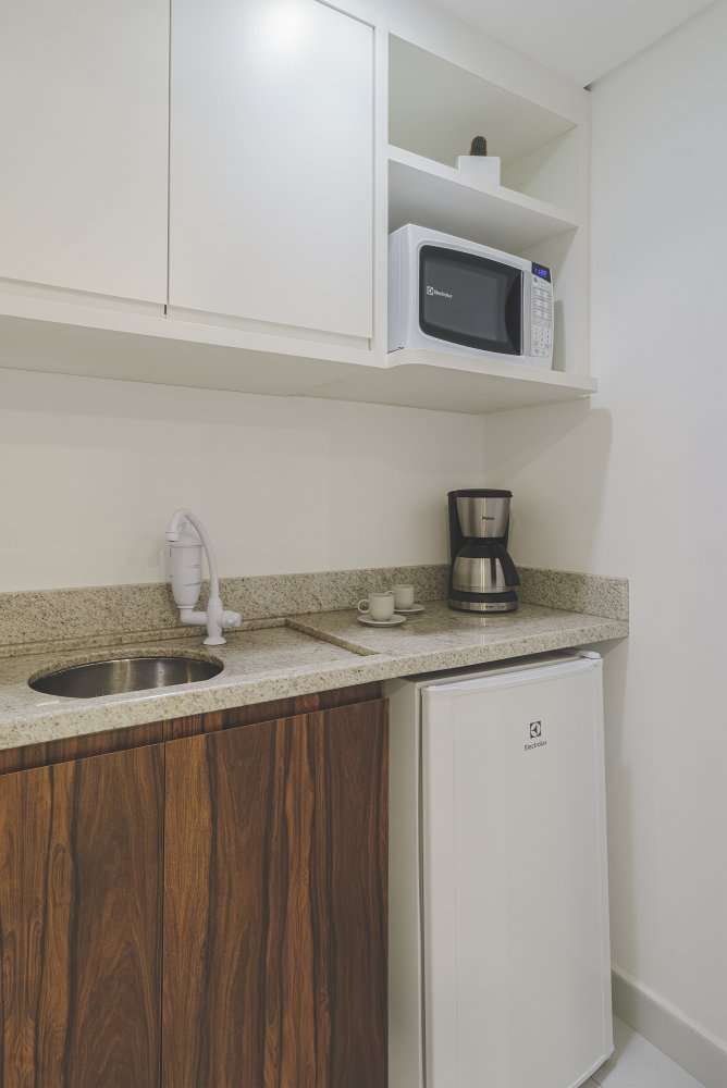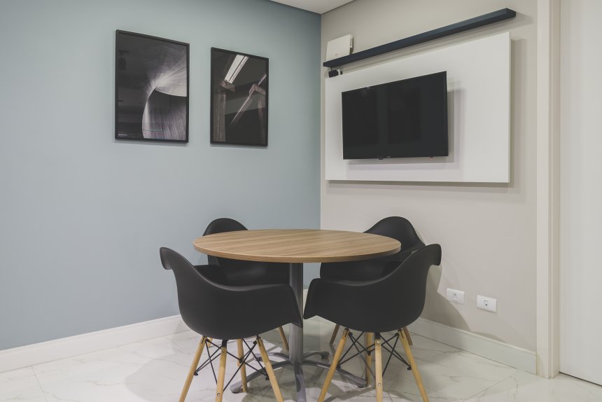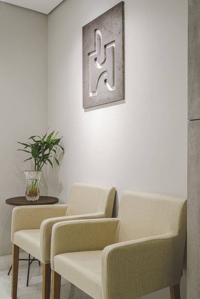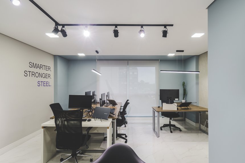 Para o projeto, focamos nas cores da marca, azul, preto e branco, trazendo elementos relacionados ao negócio (estruturas metálicas, cimento queimado), sem pesar o ambiente. Trazendo charme e conforto através do projeto de iluminação e da escolha dos materiais.