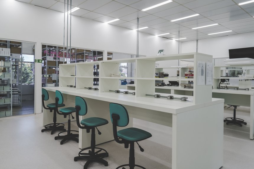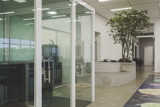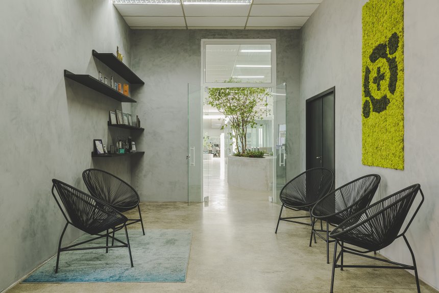 O barracão de mais 1000m2 era como uma tela em branco para nós, que aproveitamos ao máximo a iluminação natural, a conexão com a área verde externa e o pé direito super alto. Deixamos os ambientes bem conjugados através da ampla utilização de vidro, dessa forma se enxerga o laboratório de inovação o laboratório, a fábrica e todo o escritório logo da entrada. A utilização de plantas e do conceito de biofilia também ajudam a criar esse ambiente agradável e único para o trabalho.