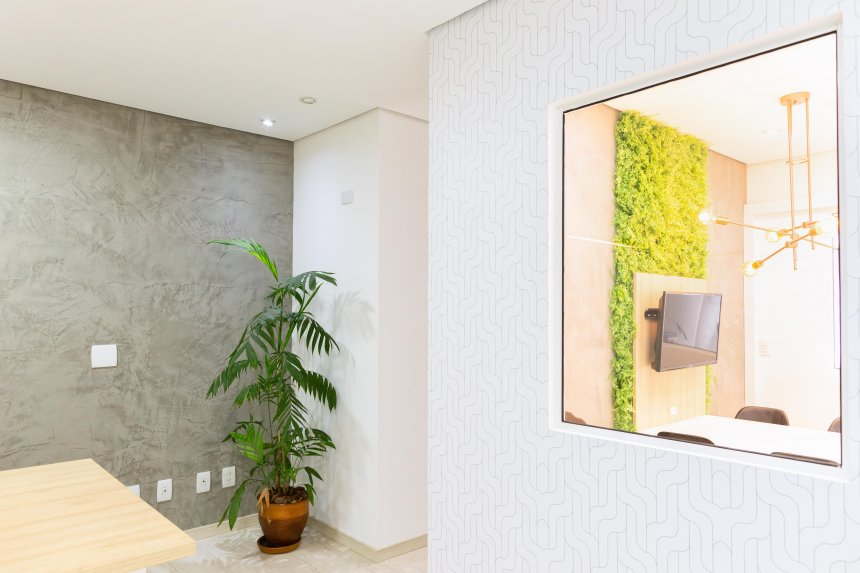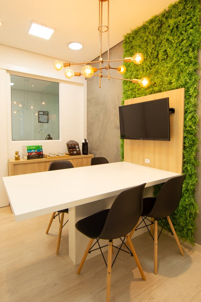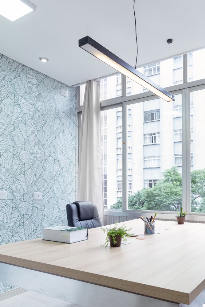 Desenvolvemos o projeto do novo escritório, valorizando as formas e cores da sua logo. O escritório passa a sobriedade e solidez necessária ao exercício da profissão, mas com leveza e acessibilidade na hora de recepcionar seus clientes. A utilização de plantas e elementos biofílicos em todo os ambientes também ajudam a criar esse ambiente confortável para o trabalho.